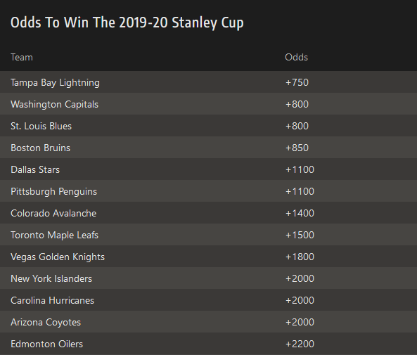 Here are the Stanley Cup Odds from OddsShark as of January 19th. They have the Lightning ahead of the Bruins, in spite of the fact that Boston is leading Tampa Bay in the division standings.