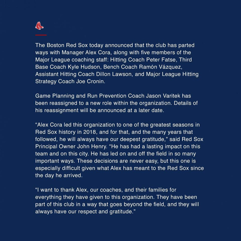 The Boston Red Sox fired manager Alex Cora, hitting coach Peter Fatse, bench coach Ramón Vázquez, third-base coach Kyle Hudson and game-planning coach Jason Varitek, sources tell ESPN. While the Red Sox won today, they are 10-17 and in last in the American League East. Massive change is coming in Boston