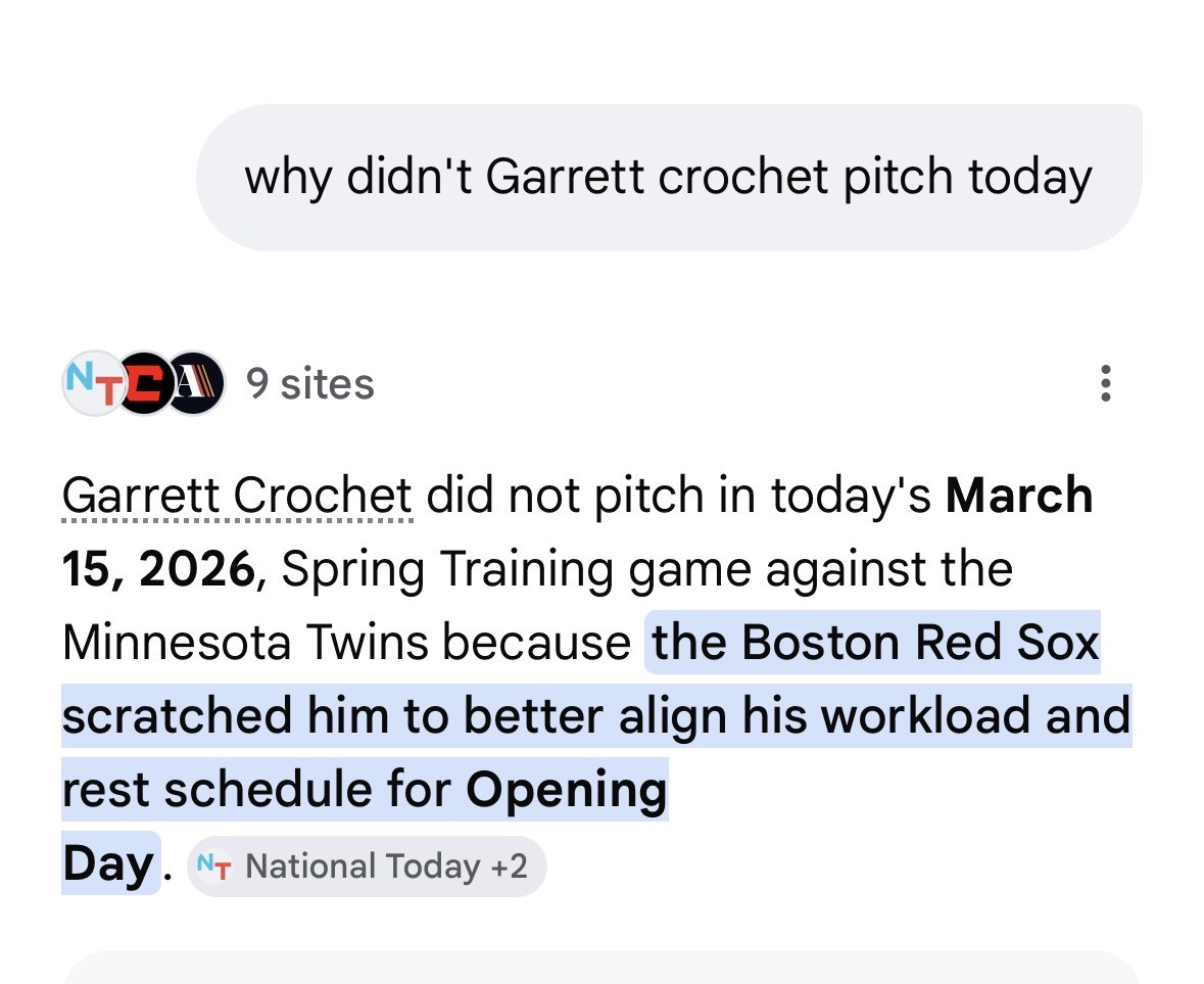 I’m on Gameday and Crochet isn’t pitching. It’s Kyle Keller.