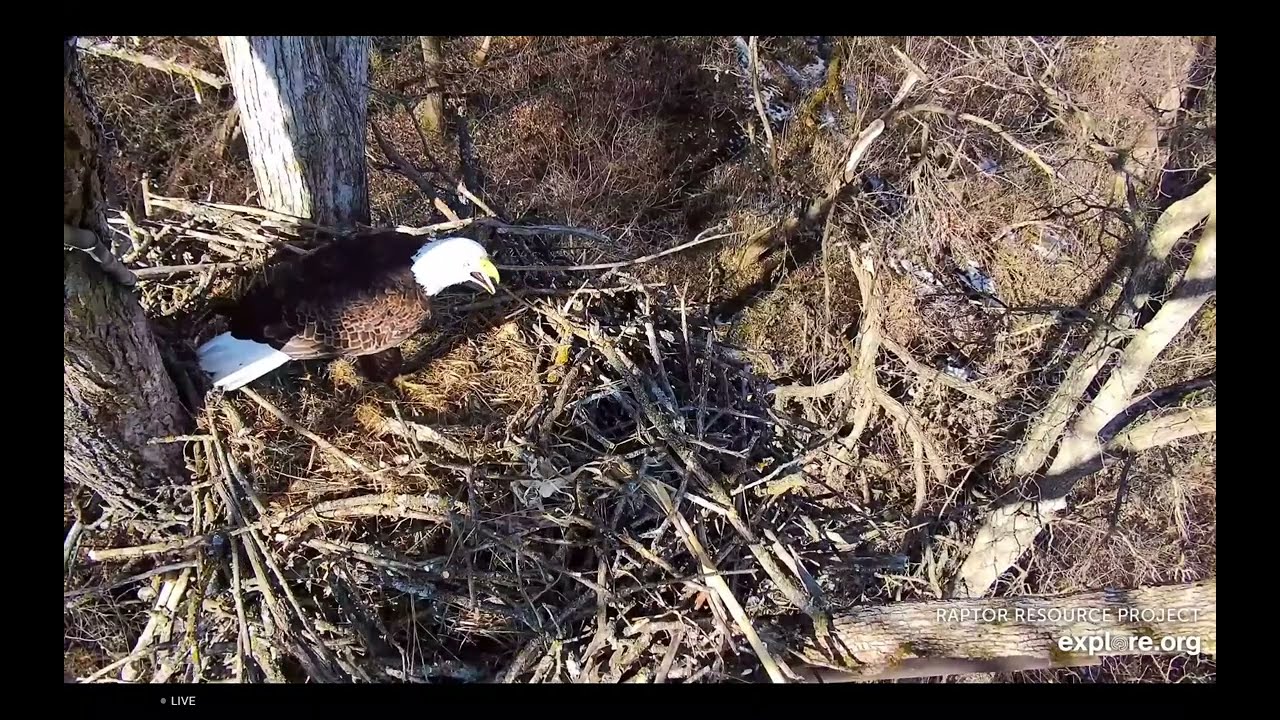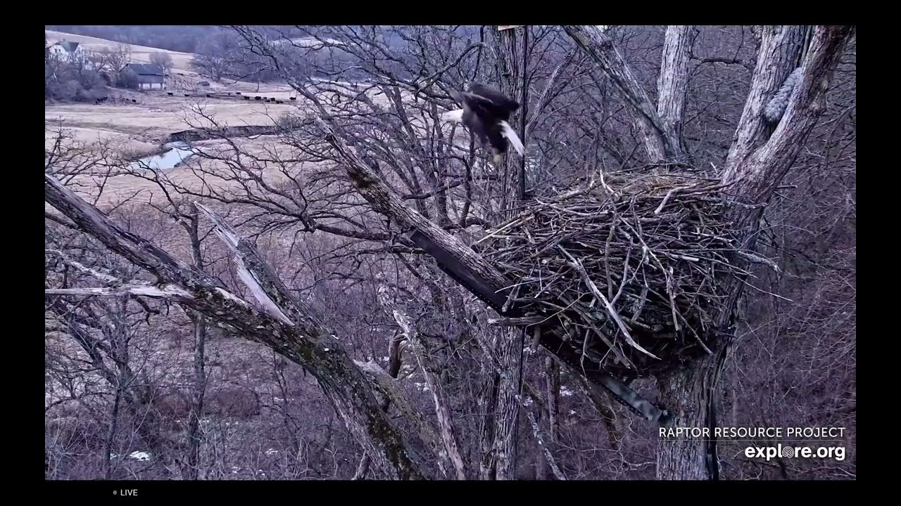 The morning began with UM flying in to perch near DNF and Mr. North. While DNF voiced her displeasure, Mr. North responded by flying out to knock UM from his branch. UM circled and then landed in the nest, with Mr. North in pursuit. After ejecting him, Mr. North returned to the nest, where DNF joined him. The pair spent some time on nestorations: a welcome moment of calm after the disruption.
