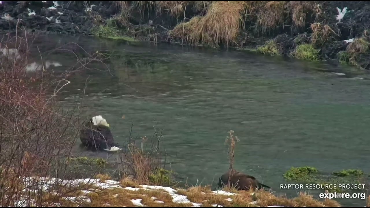 January 6, 2026: Mr. North has company with his bath – Dad? Is that you? This isn’t one of the North offspring: it’s a juvenile eagle and the North Nest failed this year. But I’m picking up ‘Are you my father?’ vibes nonetheless! Mr. North is too busy taking a splish-splash eagle bath to worry about the youngster foraging on the shore behind him, and the young eagle appears preoccupied with finding food.