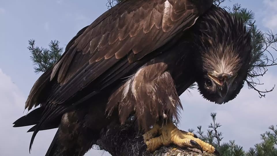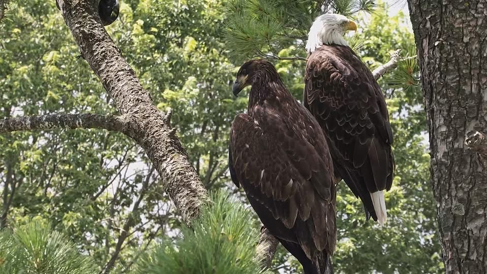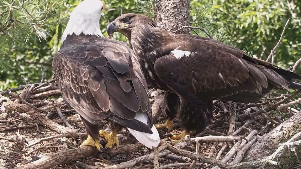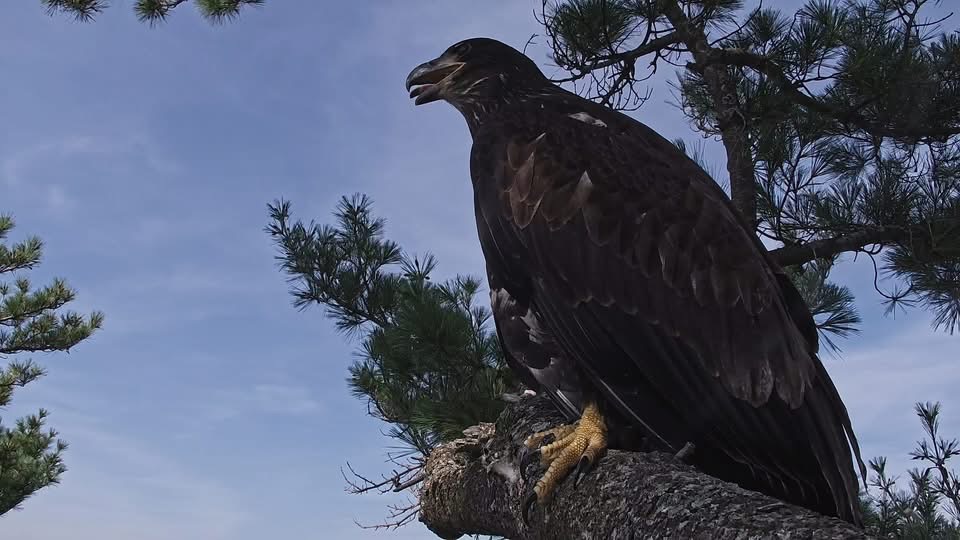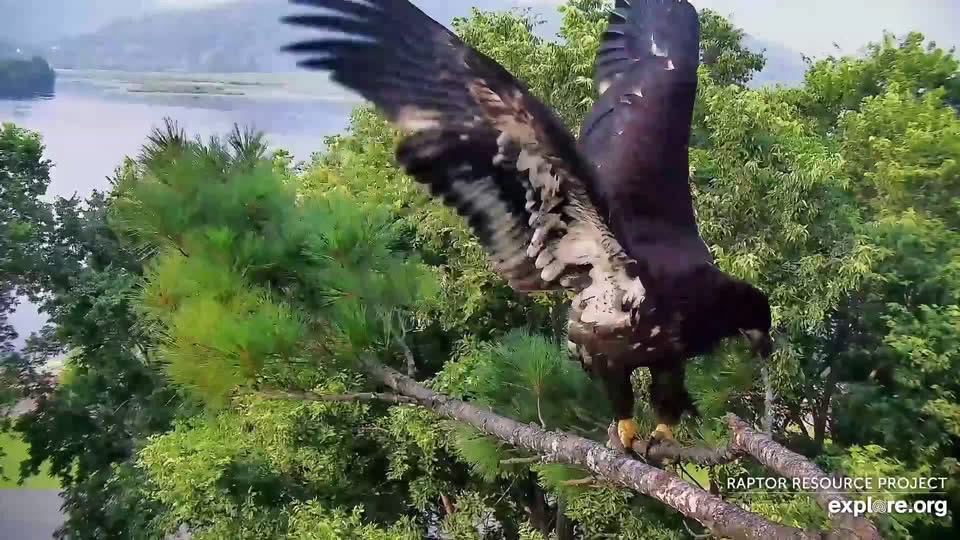 July 12, 2025: TE3 has been on the wing for two days and is exploring new parts of the nest tree and the tree next to it. Clown antics ensue!